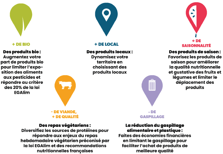 En suivant les 5 leviers proposés par Cool Food Pro : une part plus importante de produits locaux, bio et de saison et en diminuant la part de viande (mais avec plus de qualité !) ainsi que les déchets plastiques, nous obtenons des gains de CO2 (non émis dans l’atmosphère) et des gains positifs sur l’eau, la biodiversité et la santé.